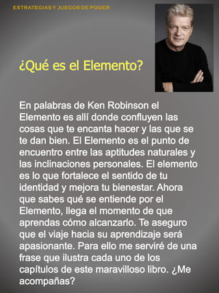 Este documento trata sobre la creatividad y el encontrar tu pasión. Algunos puntos clave son que es importante estar dispuesto a equivocarse para tener ideas originales, conectar con otras personas que comparten tus intereses, y mantener una mente abierta reconsiderando tus intereses y recuperando viejas pasiones. La educación necesita una transformación más que una simple reforma.