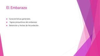 El documento describe las características generales del embarazo, incluyendo que comienza con la implantación del embrión en el útero aproximadamente 5-6 días después de la fecundación, según la OMS. Explica los signos presuntivos del embarazo como la ausencia de la menstruación y otros síntomas que pueden ocurrir del segundo al tercer mes. Finalmente, detalla que la presencia de la hormona hCG en la sangre u orina puede detectar el embarazo hasta 10 días después de la concepción.