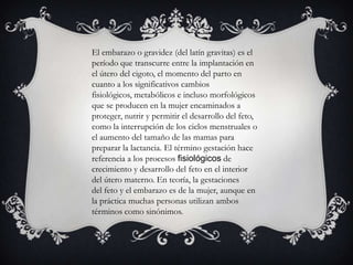 El documento describe el embarazo como el período entre la implantación del cigoto en el útero hasta el parto, durante el cual la mujer experimenta cambios fisiológicos, metabólicos y morfológicos para proteger y nutrir al feto. Estos cambios incluyen la interrupción de los ciclos menstruales y el aumento del tamaño de las mamas para preparar la lactancia. Aunque el embarazo afecta a la mujer, el término gestación se refiere específicamente al crecimiento y desarrollo del feto en el