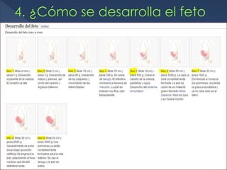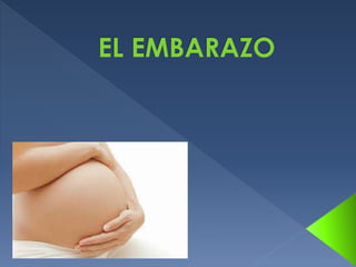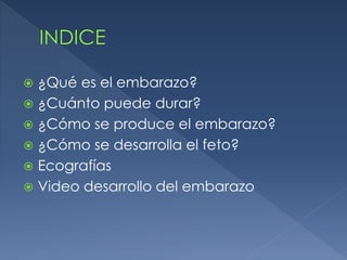 El documento describe el proceso del embarazo humano. Explica que el embarazo dura aproximadamente 40 semanas y se produce por la fecundación de un óvulo por un espermatozoide. Durante este periodo, el feto se desarrolla y crece dentro del útero, recibiendo nutrientes y oxígeno a través de la placenta y el cordón umbilical hasta el nacimiento. El documento también incluye imágenes de ecografías que muestran el desarrollo progresivo del feto a lo largo del embaraz