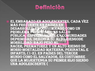 El documento habla sobre el embarazo precoz en adolescentes, el cual es un problema de salud pública en países en desarrollo. Las adolescentes embarazadas tienen un alto riesgo de morbilidad y mortalidad, así como sus bebés. El documento también discute los síntomas del embarazo, las consecuencias para la madre y el bebé, y medidas para prevenir embarazos no deseados en adolescentes.