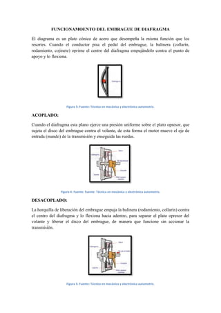 El embrague de diafragma utiliza un disco cónico de acero en lugar de muelles y patillas. Cuando se presiona el pedal del embrague, un cojinete empuja el centro del diafragma flexionándolo y presionando un plato opresor contra un disco de embrague unido al volante del motor. Esto acopla el motor a la transmisión. Soltando el pedal, la horquilla de liberación empuja el cojinete separando el plato opresor y permitiendo la desconexión.