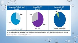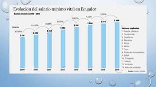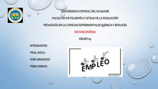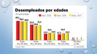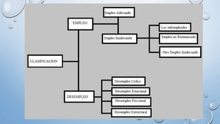 Este documento define conceptos clave relacionados con el empleo, desempleo y subempleo. Explica que el empleo es una actividad remunerada, mientras que el desempleo se refiere a la falta de trabajo y el subempleo a ocupaciones con baja remuneración e inaprovechamiento de capacidades. También analiza las tasas de empleo, desempleo y subempleo en Ecuador y propone iniciativas para fomentar el empleo juvenil. Los sectores con mayor empleo son la industria manufacturera,