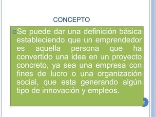 El documento define al emprendedor como una persona que convierte una idea en un proyecto concreto como una empresa o organización. Explica que existen dos tipos de emprendedores: los intraemprendedores que aplican su talento dentro de una organización y los emprendedores que crean su propia empresa. Además, señala que el espíritu emprendedor puede surgir tanto por necesidad como por aplicar conocimientos adquiridos y que requiere características como la fijación de metas claras, la búsqueda de oportunidades,