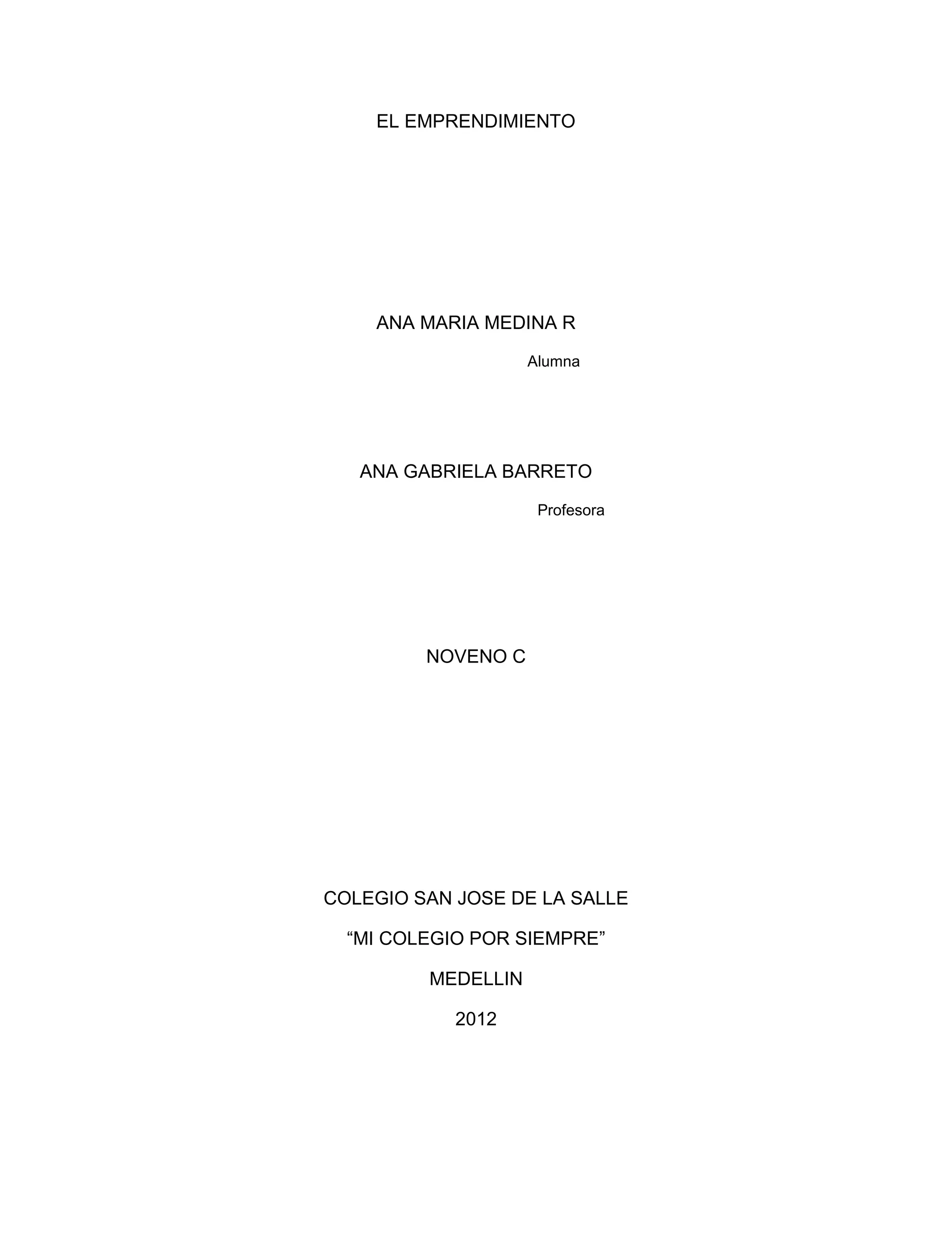 El documento presenta un resumen sobre el emprendimiento. Explica que el emprendimiento busca las actitudes necesarias para cumplir objetivos y que se enseña en los colegios para motivar a los estudiantes a alcanzar sus metas a través del estudio. Además, define a una persona emprendedora como alguien que intenta cumplir todos sus sueños y objetivos.