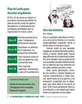 El documento habla sobre las protestas planeadas contra el gobierno colombiano en marzo y abril. Detalla un plan de acción que incluye movilizaciones el 8 de marzo, 16 de marzo, 25 de marzo y una huelga general indefinida el 16 de abril, con el objetivo de derrotar los planes del gobierno y sus reformas. También contiene artículos que critican las reformas pensional y laboral propuestas, y llaman a la defensa de los humedales de Bogotá ante proyectos de construcción.