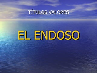 El documento define el endoso como la transferencia del dominio de un título valor mediante un escrito accesorio e inseparable del título. El endoso debe constar por escrito, ser puro y simple, y comprender la totalidad de la prestación. El endosante transfiere los derechos principales y accesorios del título al endosatario mediante la firma y entrega del título antes de su vencimiento. El endoso genera responsabilidad personal y autónoma de pago para los endosantes frente a los tenedores posteriores del título.