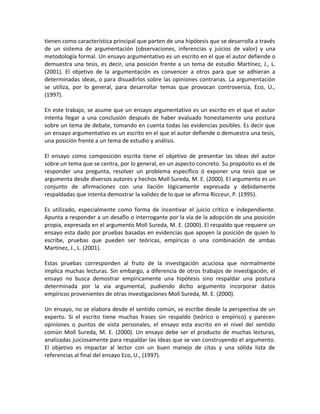 Este documento provee una guía para escribir ensayos de argumentación formal. Explica que un ensayo presenta una tesis que se argumenta a lo largo del texto utilizando evidencia. Detalla los pasos para escribir un ensayo, incluyendo establecer una tesis, relacionarla con autores y teorías, y concluir argumentando a favor de la tesis. El objetivo es demostrar la tesis mediante una argumentación lógica y fundamentada.
