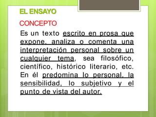 El documento presenta una clase sobre el ensayo como género literario. Explica el concepto, estructura y partes del ensayo, incluyendo la introducción, desarrollo, conclusión y bibliografía. Detalla los tipos de ensayo como el literario, filosófico, científico y argumentativo. Finalmente, describe las etapas para elaborar un ensayo como la selección del tema, recopilación de información y lectura.