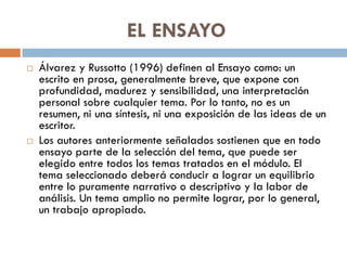 Este documento resume las características y tipos de ensayo. Define el ensayo como un escrito breve que expone una interpretación personal sobre cualquier tema de manera profunda y sensible. Explica que el ensayo debe tener una estructura libre pero organizada, un estilo elegante y exponer ideas de manera sintética. Además, presenta diferentes tipologías de ensayo según los elementos empleados en la estructura y recomendaciones para la redacción del ensayo escolar como delimitar claramente el tema, plantear un problema e