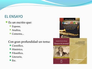 El ensayo es un escrito que expone y analiza temas desde una perspectiva personal, destacando su variedad temática y estructura libre. La elaboración de un ensayo implica seleccionar y delimitar un tema, recolectar información, y organizar las ideas en una introducción, desarrollo y conclusión. El ensayo argumentativo busca defender una tesis con rigor lógico, utilizando un lenguaje preciso y citas relevantes para respaldar el argumento.