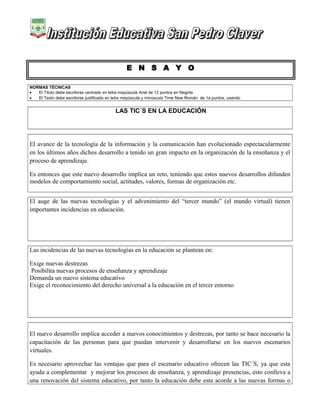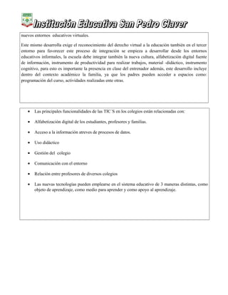 El documento discute el impacto de las tecnologías de la información y la comunicación (TIC's) en la educación. Indica que las TIC's han evolucionado rápidamente y tienen un gran impacto en la enseñanza y el aprendizaje. También plantea que las TIC's exigen nuevas habilidades, posibilitan nuevos procesos educativos y requieren un nuevo sistema educativo. Finalmente, señala que las principales funcionalidades de las TIC's en las escuelas incluyen la alfabetización digital, el acceso a la información