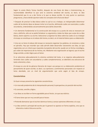 El ensayo es una composición literaria que presenta las ideas del autor sobre un tema en particular. Fue creado por Michel de Montaigne en el siglo XVI y trata sobre temas humanos. Un ensayo exitoso incluye una introducción, desarrollo de ideas a través de argumentos y citas, y una conclusión que resume la tesis principal.