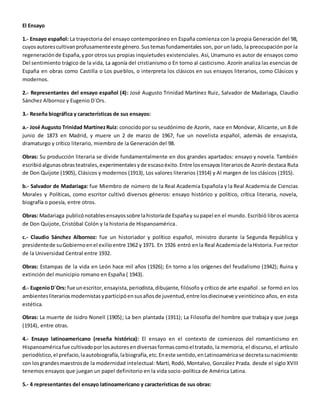 El documento resume la historia y características del ensayo en España, Latinoamérica y Venezuela. En España, el ensayo floreció con la Generación del 98, con autores como Unamuno, Azorín y Ortega y Gasset. En Latinoamérica, el ensayo se desarrolló con figuras como Martí, Rodó, Montalvo y González Prada. En Venezuela, el ensayo se consolidó con la generación positivista de Gil Fortoul, Alvarado, Zumeta, Razetti y Vallenilla Lanz.
