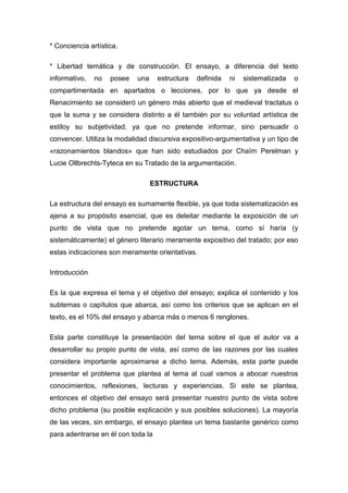 El documento define el ensayo como una interpretación libre de un tema sin necesidad de usar documentación, con el objetivo de expresar las reflexiones del autor de manera estilizada. Explica que el ensayo carece de una estructura fija y que su origen se encuentra en la oratoria griega y romana antiguas. Además, destaca que el ensayo busca persuadir más que informar a través de argumentos flexibles.