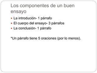 Este documento proporciona instrucciones para escribir un ensayo de 5 párrafos. Explica que la introducción debe contener la tesis y 3 oraciones de apoyo, mientras que los 3 párrafos del cuerpo deben abordar cada detalle con ejemplos y palabras de transición. La conclusión debe reformular la tesis.