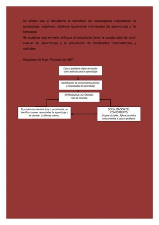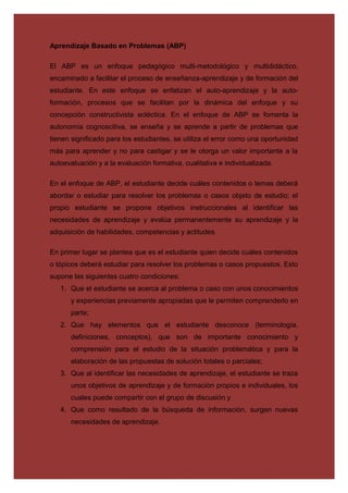 El Aprendizaje Basado en Problemas (ABP) es un enfoque pedagógico que facilita el aprendizaje mediante la resolución de problemas significativos para los estudiantes. En este enfoque, el estudiante identifica sus propias necesidades de aprendizaje y objetivos para resolver los problemas, y tiene la oportunidad de autoevaluar su progreso. El proceso involucra identificar conocimientos previos, aprender de forma autónoma utilizando recursos, y socializar el conocimiento en grupos tutoriales aplicándolo a los casos o problemas.