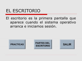 El documento describe 6 prácticas relacionadas con la personalización del escritorio en un sistema operativo. La primera práctica explica cómo organizar manualmente o automáticamente los iconos del escritorio. La segunda práctica detalla tres métodos para crear accesos directos en el escritorio. La tercera práctica indica cómo cambiar las propiedades de un acceso directo existente. La cuarta práctica muestra cómo mostrar y personalizar la barra de inicio rápido. La quinta práctica explica el proceso de cambiar el fon