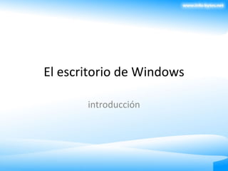 El documento describe los elementos básicos del escritorio de Windows, incluyendo el iconos, el fondo y la barra de tareas. Explica que el escritorio provee el entorno inicial de trabajo en el sistema operativo y ha permanecido similar desde Windows 95, aunque ha habido cambios significativos en las versiones Vista y 7.