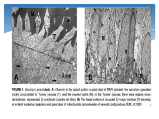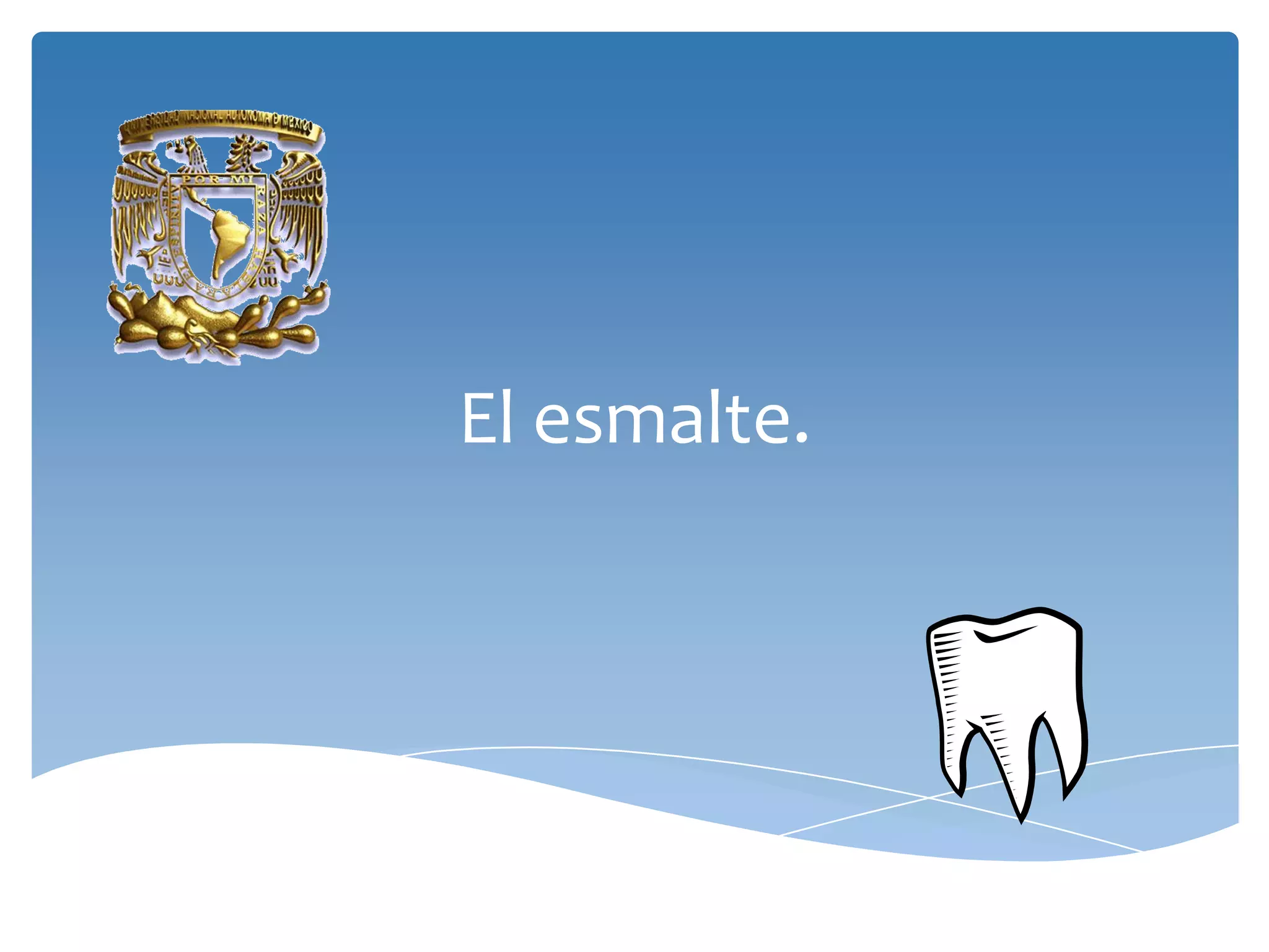 El esmalte es una cubierta protectora muy dura producida por las células ameloblastos antes de la erupción de los dientes y compuesta principalmente de hidroxiapatita, el mineral más duro del cuerpo humano. El esmalte está formado por unidades estructurales llamadas prismas de esmalte. Su principal función es proteger el diente de agresiones externas aunque es vulnerable a la desmineralización por ataques ácidos repetidos.