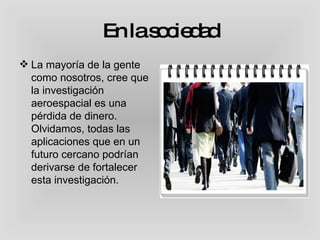 El documento discute los avances en la carrera espacial y cómo las investigaciones de la NASA y agencias espaciales han llevado al desarrollo de muchos productos de uso cotidiano. También describe algunos de los primeros astronautas como Neil Armstrong, Yuri Gagarin y Valentina Tereshkova. Finalmente, anima a continuar las exploraciones espaciales para beneficiar el futuro de la humanidad.