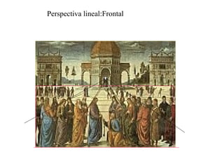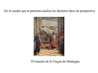 El documento describe diferentes tipos de perspectiva como la perspectiva lineal frontal, la perspectiva del tamaño, la perspectiva aérea, el orden en el espacio, la perspectiva del detalle y el uso de tonos oscuros y claros. Analiza los distintos tipos de perspectiva en el cuadro "El transito de la Virgen" de Mantegna.