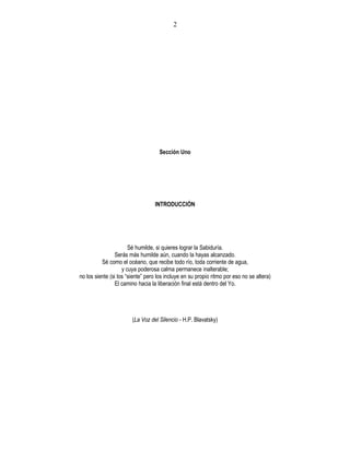El documento presenta un resumen de un libro titulado "El Espacio, el Tiempo y el Yo" de Norman Pearson. El libro explora preguntas sobre el significado de la vida, la relación entre el hombre, Dios y el universo. El autor cree que la Teosofía, una filosofía que combina la sabiduría oriental y occidental, puede brindar respuestas a estas preguntas. El documento luego presenta una introducción más detallada sobre algunos conceptos y principios clave de la Teosofía.