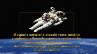 El espacio exterior se refiere a las regiones relativamente vacías del universo fuera de las atmósferas de los cuerpos celestes, aunque se suponía que estaba vacío y ahora se sabe que contiene la mayor parte de la materia del universo.