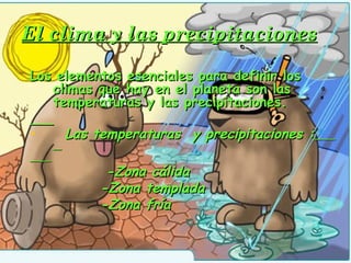 Este documento describe las tres principales zonas climáticas de la Tierra (cálida, templada y fría) según las temperaturas y precipitaciones. La zona cálida se encuentra alrededor del ecuador y tiene temperaturas constantes y elevadas. La zona templada se encuentra entre los trópicos y los círculos polares, con temperaturas que varían según las estaciones. La zona fría se encuentra en los polos y tiene las temperaturas más bajas debido a la inclinación de los rayos solares.