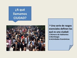 El documento define la ciudad y describe sus principales características y funciones. Una ciudad se define por su número de habitantes, morfología y actividades económicas. Las funciones clave de una ciudad incluyen la residencial, industrial, administrativa y comercial. La morfología urbana se refiere a la forma y distribución de los edificios en la ciudad, y puede analizarse usando planos y fotografías aéreas.
