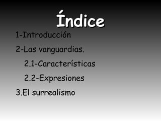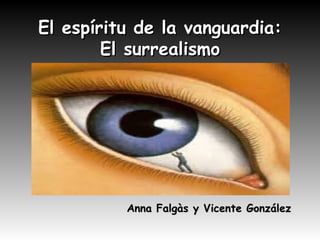 El documento describe las vanguardias artísticas del siglo XX, en particular el surrealismo. Explica que las vanguardias buscaban renovar los géneros artísticos centrándose en la forma. Menciona movimientos como el futurismo, cubismo, dadaísmo y ultraísmo. Luego describe el surrealismo, que perseguía la liberación del ser humano a través de la desrealización de la realidad para acceder a otra más auténtica. Finalmente, nombra algunos de los principales poetas y artistas surrealistas de