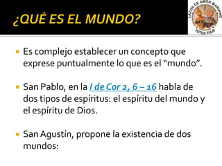 El documento discute el concepto de "mundo" y contrasta las enseñanzas y valores del mundo con las enseñanzas de Dios y Jesús. Explica que el mundo promueve el egoísmo, la riqueza, el engaño y el placer mientras que Dios promueve la piedad, la decencia y el cumplimiento de las leyes sagradas.