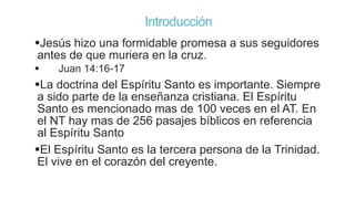 El documento describe al Espíritu Santo como la tercera persona de la Trinidad. Explica que el Espíritu Santo es una persona con intelecto, emociones y voluntad, no meramente una influencia. También describe la obra del Espíritu Santo como inspirar la Biblia, guiar a las personas a Cristo, morar en los creyentes, guiar a la iglesia, consolar a los creyentes, enseñarles y darles seguridad. Finalmente, explica cómo el Espíritu Santo guía a los creyentes a descubrir