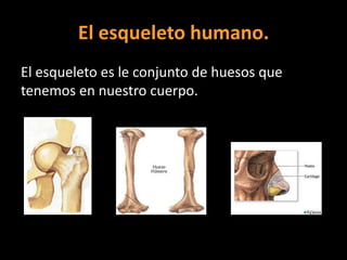 El documento describe los principales huesos que componen el esqueleto humano. El esqueleto cumple tres funciones: sostener el cuerpo, permitir el movimiento y proteger órganos. Incluye huesos de la cabeza como el cráneo y la cara, del tronco como las costillas y la columna vertebral, y de las extremidades como los huesos del brazo, la pelvis y el pie.