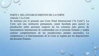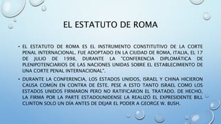 El Estatuto de Roma establece la Corte Penal Internacional, adoptado el 17 de julio de 1998, con el objetivo de juzgar crímenes internacionales graves como genocidio, crímenes de lesa humanidad y crímenes de guerra. La corte es una institución permanente con sede en La Haya, y su jurisdicción es complementaria a las jurisdicciones penales nacionales. Estados Unidos e Israel firmaron el tratado, pero no lo ratificaron, y la corte operará de acuerdo a lo estipulado en el estatuto.