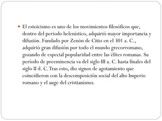El estoicismo fue una escuela filosófica fundada por Zenón de Citio en el 301 a. C. que enseñaba que se puede alcanzar la libertad y la felicidad a través del autodominio y la virtud, rechazando las comodidades materiales. Los estoicos creían que la razón humana forma parte del logos divino y universal que rige la naturaleza, y promovieron una visión cosmopolita y una ética basada en la naturaleza humana. La doctrina estoica influyó en el pensamiento posterior de Occidente.