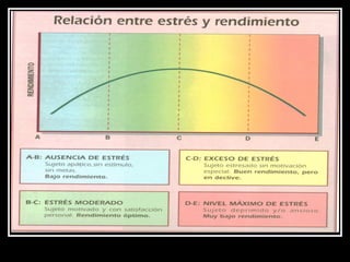 El documento habla sobre el estrés, definiéndolo como la reacción ante demandas físicas o mentales. Explica que hay dos componentes del estrés: los estresores o agentes estresantes y la respuesta al estrés. También describe las fases del estrés, las reacciones físicas y emocionales al estrés, y diferentes formas de manejarlo como el ejercicio, la nutrición, técnicas de relajación y apoyo social.