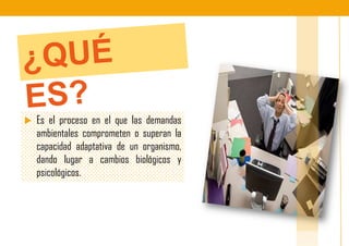 El documento describe el estrés laboral, explicando que es el proceso en el que las demandas ambientales superan la capacidad de adaptación de un organismo, causando cambios biológicos y psicológicos. Señala que un estresor es cualquier circunstancia percibida como amenaza o que sobrepasa la capacidad de respuesta, y que el estrés puede ser agudo o crónico, positivo o negativo. Además, explica las fases de alarma, resistencia y agotamiento por las que pasa el cuerpo ante el estrés, así como los efectos f
