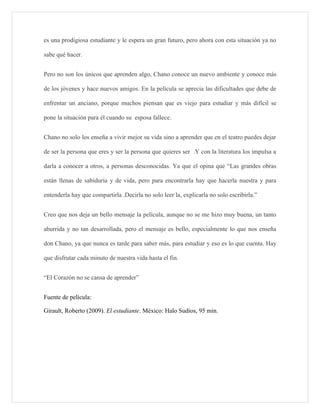La película cuenta la historia de Chano, un hombre de 70 años que se inscribe en la universidad para estudiar literatura a pesar de las dificultades. Chano ayuda a un grupo de estudiantes jóvenes, enseñándoles sobre el amor, la vida y el arte. También les muestra que nunca es tarde para aprender. Aunque la película es un poco aburrida, deja un mensaje positivo sobre seguir disfrutando de la vida y el aprendizaje hasta el final.