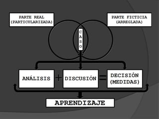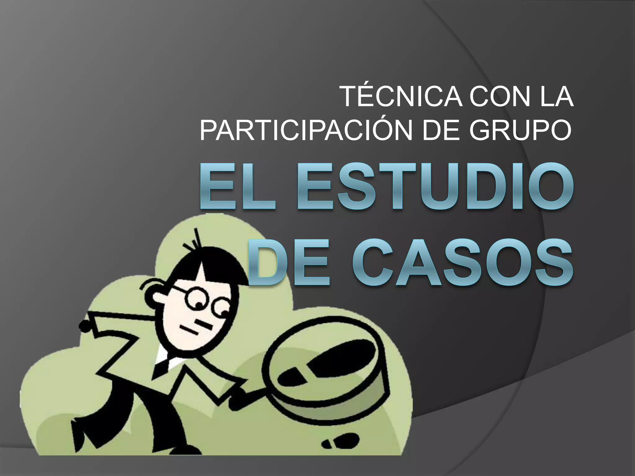 El documento presenta la técnica del estudio de casos como un método de enseñanza grupal que permite a los alumnos analizar problemas reales y proponer soluciones, fomentando el trabajo cooperativo y el pensamiento crítico. Se exploran los objetivos, fases y recursos necesarios para su implementación, así como los beneficios y desafíos asociados a su uso en el aula. Además, se enfatiza la importancia de preparar adecuadamente el caso y facilitar un ambiente propicio para el aprendizaje y la discusión.