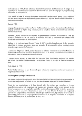 La teoría de lenguajes de programación estudia el diseño, implementación, análisis y clasificación de lenguajes de programación. Es un campo multidisciplinario que depende de matemáticas, ingeniería de software y lingüística. Algunos hitos clave incluyen el desarrollo del cálculo lambda en los 1930, el primer lenguaje de programación Plankalkül en los 1940, y lenguajes exitosos como Fortran, ALGOL y Lisp en los 1950-1960, que establecieron la investigación sobre lenguajes de program