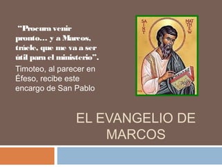 Marcos era un joven cristiano que acompañó a Pedro y Pablo en sus viajes misioneros. Escribió el evangelio más antiguo dirigido a cristianos no judíos para explicar quién era Jesús, el Hijo de Dios. Su evangelio presenta a Jesús realizando milagros y enseñando a través de parábolas para anunciar el Reino de Dios antes de su muerte y resurrección.