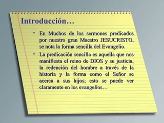 El documento describe la predicación sencilla de Jesucristo sobre el Reino de Dios, las bienaventuranzas y el camino al Padre. Argumenta que a pesar de que algunos pasajes bíblicos parecen difíciles, el evangelio en sí es sencillo y fácil de entender, y que la salvación eterna se ofrece a través de Jesús. Concluye exhortando a predicar el mensaje bíblico sencillo a todas las naciones.