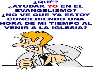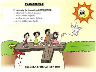 Este documento discute la misión de evangelizar y discipular. Define el evangelismo como evangelizar (compartir el mensaje de salvación) y discipular (enseñar a los nuevos creyentes). Explica estrategias para evangelizar como predicación callejera y uso de medios. Enfatiza la importancia de presentar el plan de salvación, usar lenguaje sencillo y evitar confrontaciones. Concluye que la evangelización requiere preparación y debe hacerse con amor, y que los nuevos creyentes deben ser instruidos en la oración y lectura bí