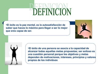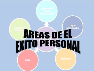 El documento discute el concepto de éxito y las diferentes áreas en las que una persona puede tener éxito. Define el éxito como la paz mental y la autosatisfacción de saber que estás haciendo lo máximo para ser lo mejor que puedes ser. Explica que el éxito moderno requiere una buena combinación de logros en las áreas profesional, familiar, socio-afectiva y espiritual. Finalmente, proporciona consejos sobre cómo alcanzar el éxito personal a través de la confianza en uno mismo, la preparación continua y