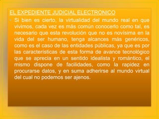 Este documento describe los beneficios del expediente judicial electrónico sobre el expediente en papel, incluyendo una mayor eficiencia, acceso público, seguridad y menor riesgo de pérdida de documentos. También presenta ejemplos de países como Uruguay y Chile que han adoptado con éxito el expediente judicial electrónico y discute los esfuerzos iniciales del Poder Judicial del Perú para implementar un sistema similar.