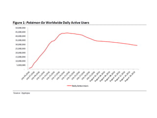 El documento analiza el fenómeno de Pokémon GO, destacando su mecánica de juego y su impacto social. Se menciona que ofrece beneficios como ejercicio físico y socialización, a pesar de cuestionar la calidad del diseño del videojuego. Además, se señala su notable éxito económico, generando entre 1 a 2 millones de dólares al día.
