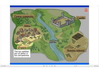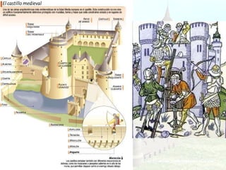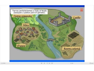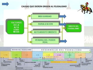 El documento describe las causas y la estructura de la sociedad feudal en Europa durante la Edad Media. Las invasiones de vikingos y eslavos llevaron a que la gente buscara protección con los grandes señores feudales a cambio de trabajo, dando origen al sistema feudal. La sociedad feudal se dividía en tres estamentos - la nobleza que luchaba, el clero que oraba, y los campesinos que trabajaban. Dentro de los feudos, los señores concedían tierras a los vasallos a cambio de lealtad y servicios