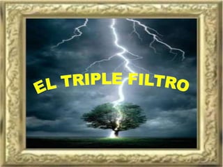 Sócrates le explica a un conocido el "Examen del triple filtro" antes de contarle algo sobre un amigo. El filtro consiste en verificar que la información sea verdadera, buena y útil. Si no pasa estos tres filtros, no vale la pena compartirla ya que podría dañar la amistad. Sócrates concluye aconsejando aplicar este triple filtro para proteger las amistades de comentarios sin fundamento.