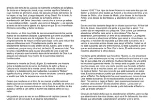 Este documento analiza el capítulo 10 del libro de los Jueces en la Biblia. Explica que los hijos de Israel habían abandonado a Dios para servir a otros dioses, por lo que Dios los entregó a sus enemigos los amonitas. Describe que los amonitas representan el amor propio, ya que descienden del incesto entre Lot y sus hijas. También presenta a Jefté como un tipo de Jesucristo, quien fue enviado para liberar al pueblo del dominio de los amonitas y su amor propio. El objetivo